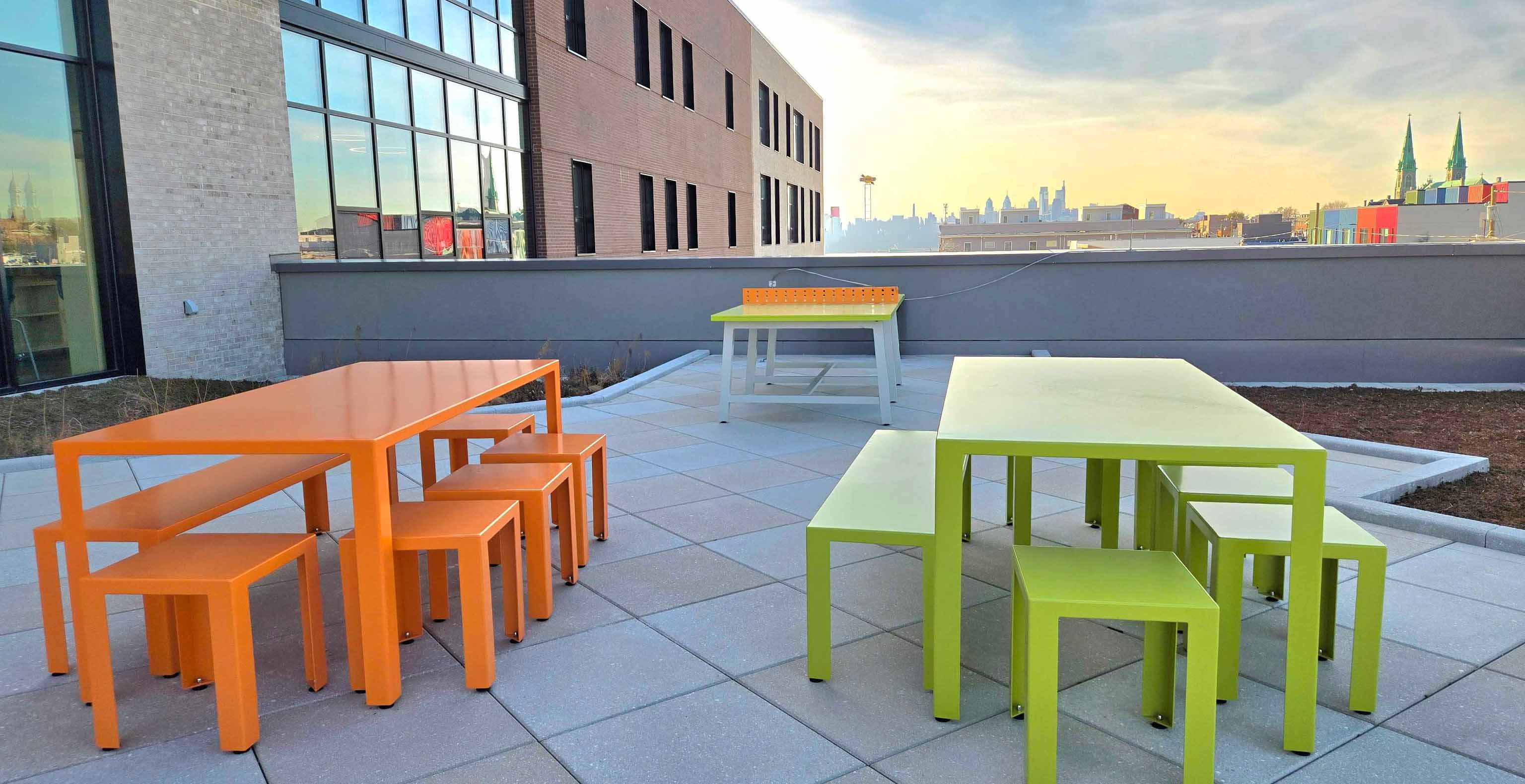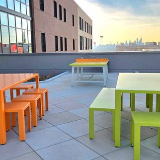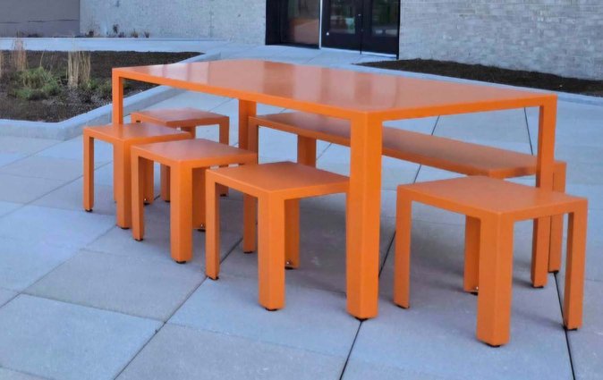 Accompanying benches or tri-stools are available at heights of 12″, 14″, 16″ and 18″.