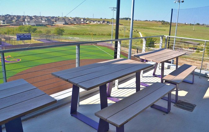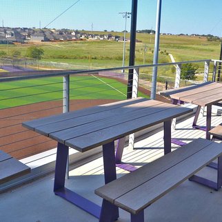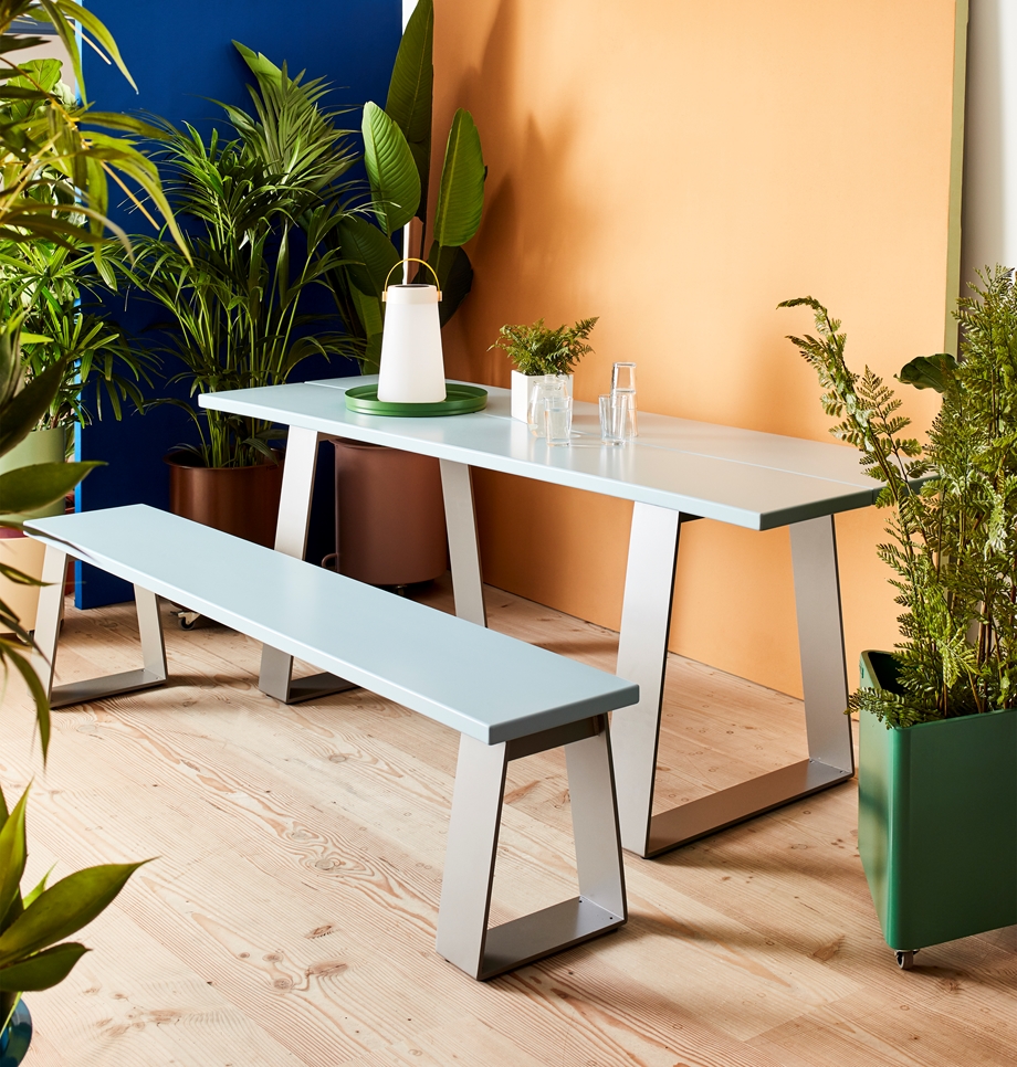 The aluminum top can be colored to match the base on the table and bench. Can be used both indoor and outdoor.